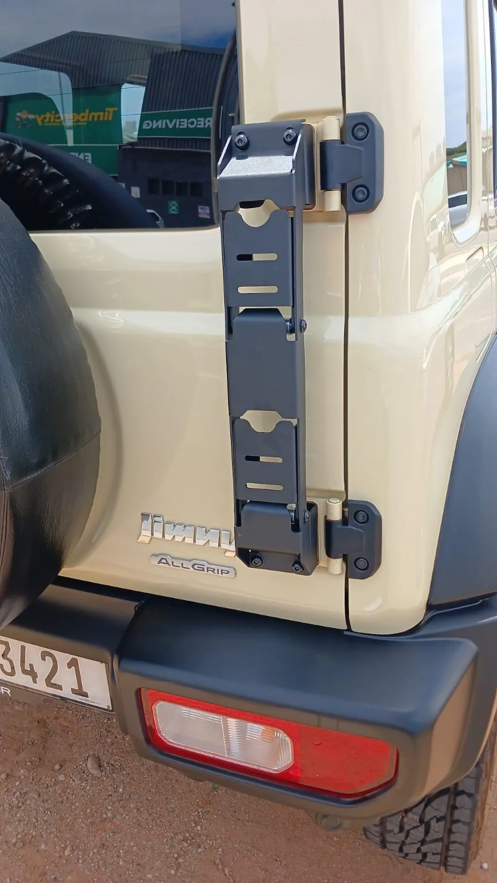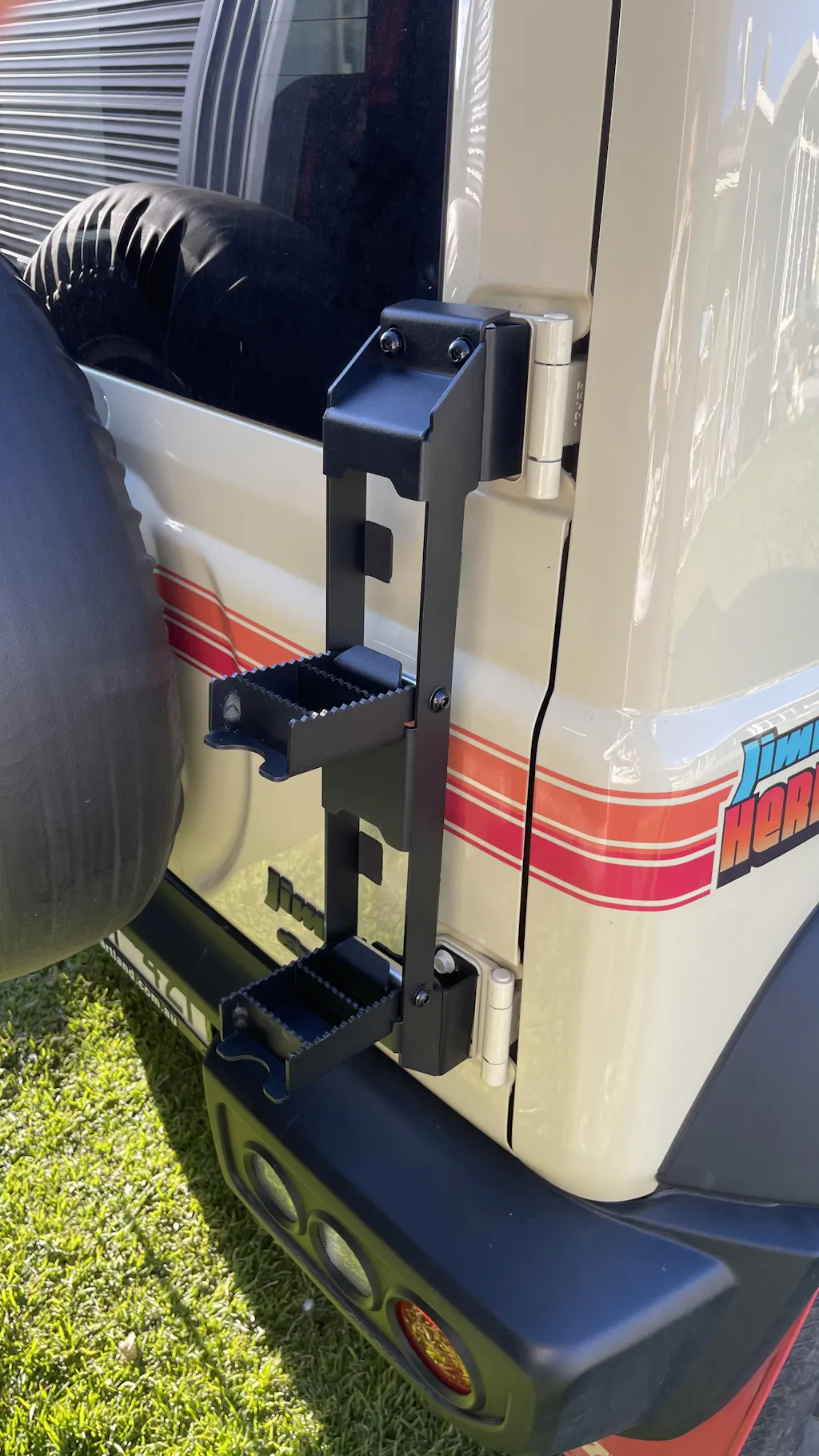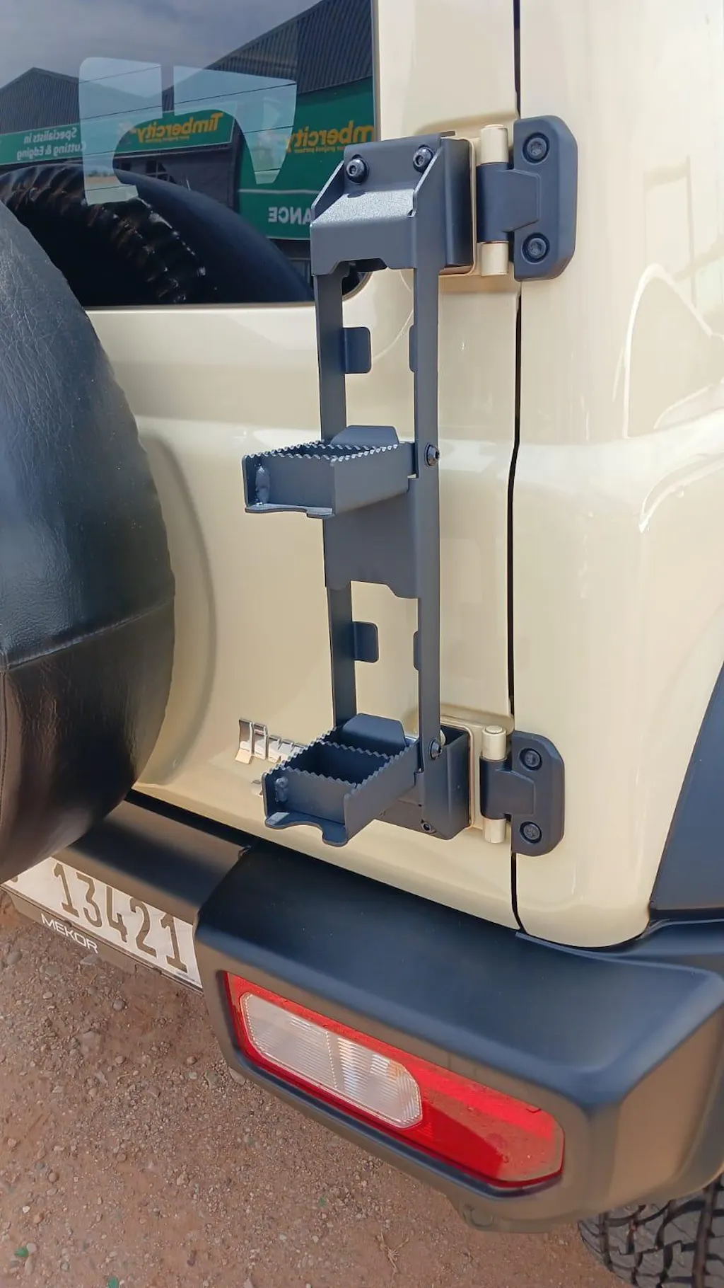 Installing the fold-out ladder on the back of your Jimny means you can easily access the roof for securing your adventure gear. Plus, you can enjoy bigger tires on the back since this fold-out, slimline ladder takes up so "wittle" space.